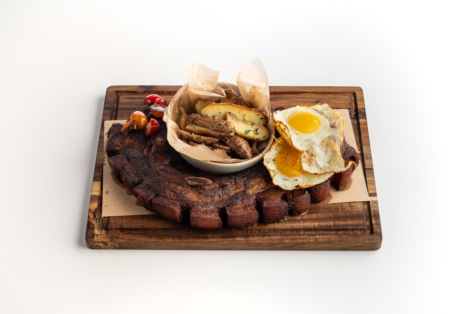 2 Pound Pork Chop | 2 Fried Eggs| Charred Tomatoes | Parmesan Hash Brown
