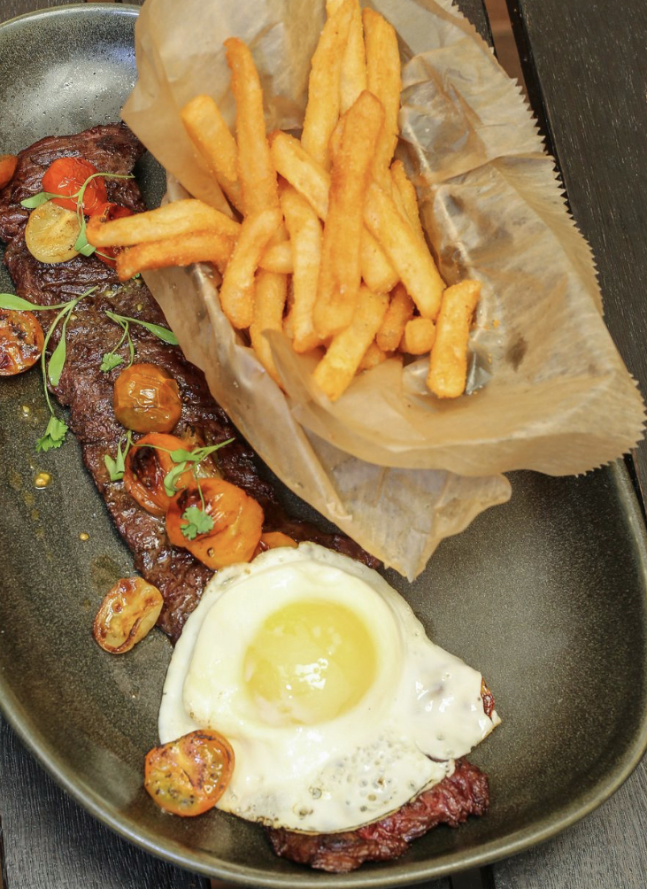 10 oz Grilled Skirt Steak | Fried Egg (Cooked Medium) | Tomatillo Salsa | Charred Tomato | Grails French Fries